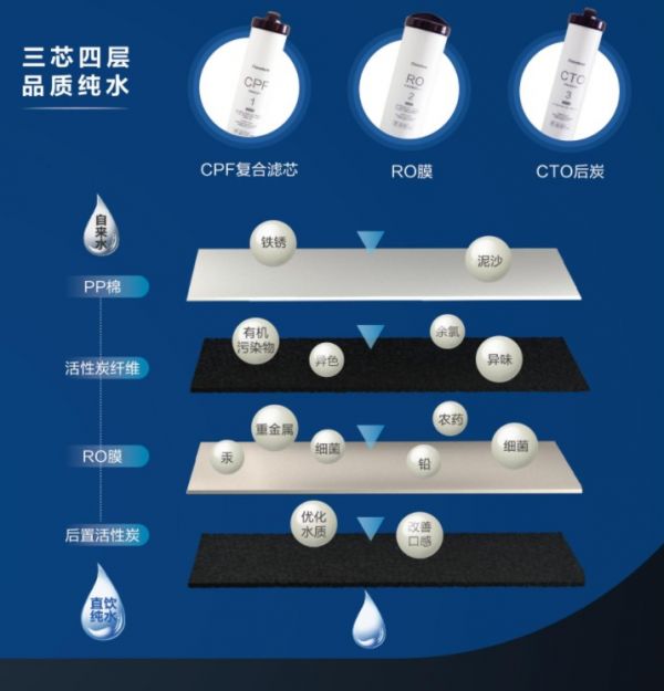 与普通净水器不同,海鸥HiO净水器结合了CPF复合滤芯、高精度RO膜、CTO后炭三重滤芯,通过四层滤净过程,将水中大型粒子、微粒、污染物、余氯、细菌、农残等有害物质高效过滤,为广大消费者的饮水健康提供安全保障。