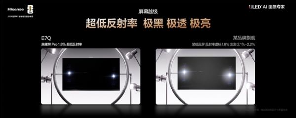 这次海信E7Q全尺寸升级黑曜屏Pro,这款由海信自研的抗反光屏幕,素有“低反标杆”称号,其抗反光能力达到普通屏幕的3倍,黑度也领先行业3倍,根据数码博主“蓝大仙人”实机测评,黑曜屏Pro反光率低于1.8%,低反表现优于某厂商的线上旗舰机型。其“极黑、极亮、极透”的特性,可以轻松化解白天电视画面泛白的问题,即使在阳光直射下,也能保持高亮鲜活的观看效果。