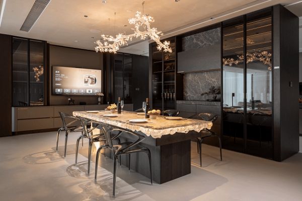 餐厅,轻轻一按,电视隐于无形;茶室,智能茶台,在从“品茶”到“品空间”的沉浸, 感受隔空传茶的“黑科技”;衣帽间,升降智能岛台,优雅收纳新境界,实现从“收纳”到“造型管家”的进化。