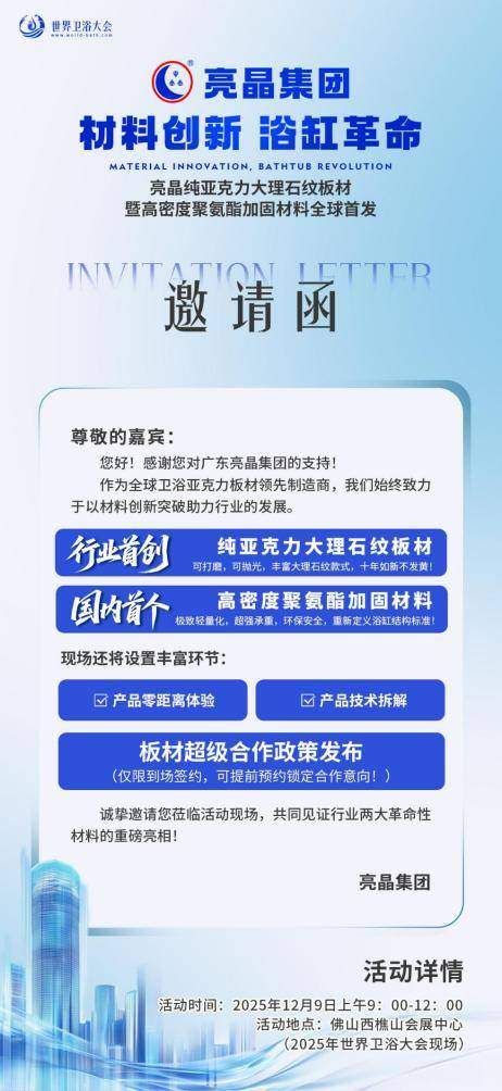 当全球卫浴目光聚焦佛山,行业精英齐聚2025世界卫浴大会,一场颠覆行业的材料创新盛宴正蓄势待发!2025年12月9日,与2025世界卫浴大会同期同馆,全球卫浴亚克力板材领先制造商亮晶将重磅举办“材料创新浴缸革命”专属发布会,全球首发纯亚克力大理石纹板材与高密度聚氨酯加固材料两大核心新品。