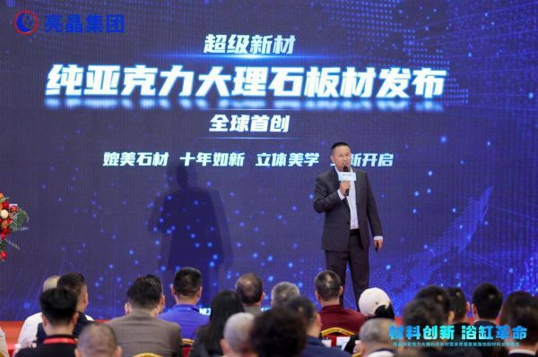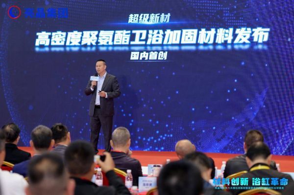 作为深耕卫浴亚克力板材领域19载的国家高新技术企业,亮晶集团自2007年创立以来,始终以“成为全球卫浴亚克力板材标杆”为愿景,研发投入强度持续高于行业平均水平,其发展路径精准契合国家对建材行业“科技创新驱动、绿色低碳转型”的核心要求。发布会上,王钧董事长系统解读了两大新品的技术内核:【高密度聚氨酯加固材料】通过结构性能革新实现卫浴产品轻量化与耐用性的双重提升,符合绿色建材节能降耗的政策导向;【纯亚克力大理石纹板材】则将高端美学与实用功能深度融合,响应了家装厨卫“焕新”行动中对高品质绿色建材的市场需求。