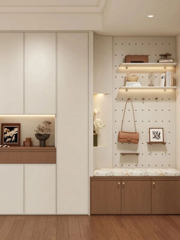 玄关左侧定制了组合式功能柜,集成鞋柜、洞洞板与换鞋凳,出入时挂包、换鞋的动线一气呵成。