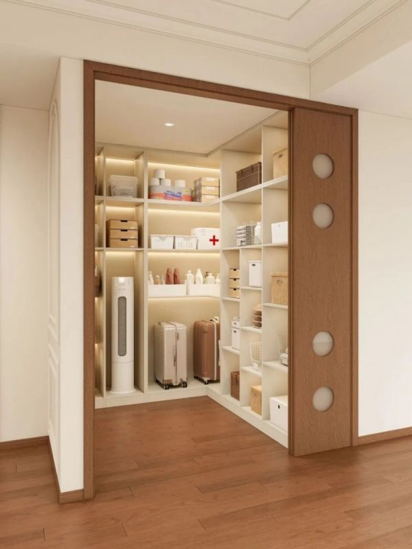 右侧则规划为一个步入式的入户储物间(俗称“800库”),将家庭杂物尽数收纳其中,进门第一眼便觉清爽利落。