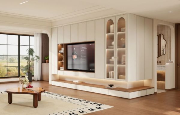 客厅打造L型满墙电视柜,提供了堪称奢侈的储物容量,满足家庭囤货所需,无需为收纳而断舍离。一字型延伸台面便于放置路由器等设备,让各类线缆隐藏无踪。圆弧造型的玻璃柜门,既防尘又透光,在提升空间通透感的同时,也让整体颜值大幅跃升。
