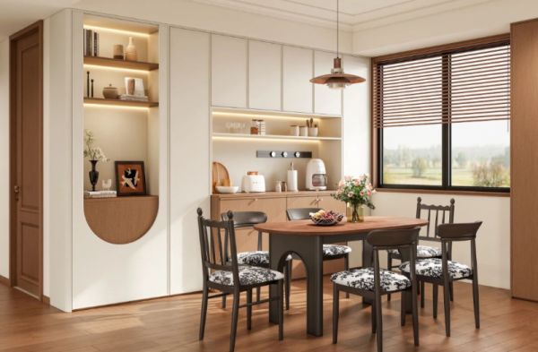 餐厅以温柔的奶酪白与胡桃楸色为主调,视觉上耐看而舒适。柜体左侧设计为柔和的圆弧壁龛造型,内置灯带,氛围感十足。餐边柜中部留空并配备插座,方便使用各类小家电,轻松打造一个便捷的早餐角。