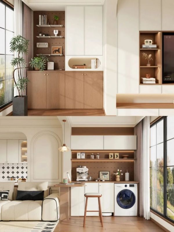 阳台一侧为储物柜与装饰墙的结合,美观且实用;另一侧作为生活区,完美嵌入洗衣机与扫地机器人。定制的L型台面形成了一个休闲小吧台,无论是临时办公还是品茶小憩,都能在此找到惬意。