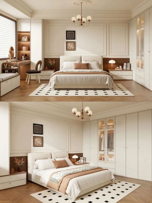 主卧整合了梳妆台、开放式收纳格与舒适卡座,开启氛围灯后,瞬间变成一个精致的私人美妆角。床头采用拼色护墙板与石膏线装饰,丰富了空间层次,营造出慵懒而不失优雅的休憩氛围。