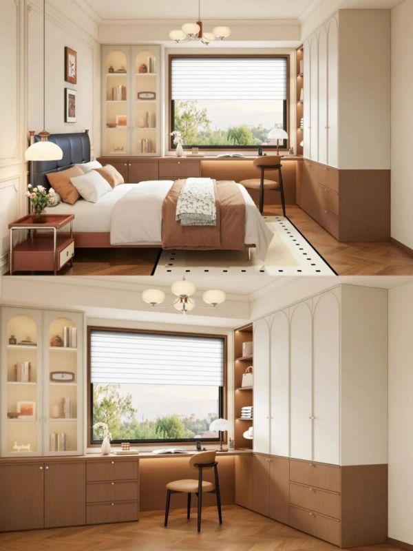 次卧采用衣柜、书桌与储物柜一体化设计,整体性极强,半包围的布局带来满满的安全感。展示柜选用复古的拱形玻璃门,内部摆上心爱的小摆件,立刻变身为一个充满个人趣味的宝藏展示角。