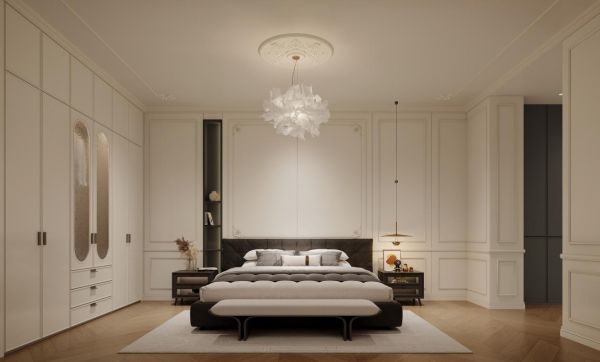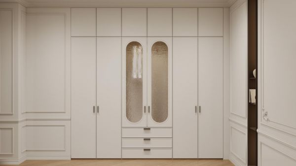 卧室空间重点呈现出静谧包裹与私密仪式感的交融氛围。卧室是终极的休憩与修复之所。整体空间在白色主基调营造的纯净、静谧氛围中展开,局部以墨脱黑进行恰到好处的点缀与压衬,让气息沉淀,视觉归于宁谧。柔波柜门是塑造空间情绪的关键,其蜿蜒的弧线带来视觉上的柔软抚慰,朦胧玻璃后的物件影影绰绰,平添一分梦幻与私密感。每一次开合柜门,定制金属拉手所带来的细腻手感与恰到好处的阻尼反馈,都将日常动作升华为一种充满仪式感的优雅体验。更令人惊喜的是,柜内精心装饰的繁花纹样背板,在每次开启的瞬间显露,为最私密的更衣时光,注入一份不期而遇的愉悦与美好,于细微处彰显对居住者情绪价值的深切关怀。