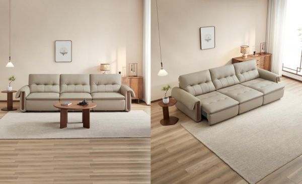 移山沙发提供常规款与电动款两种配置,电动款三个电机独立调节,贵妃、双人位、大床模式随意切换,多场景适用。进口头层牛皮面料,细腻亲肤,耐磨耐用。分段式靠背搭配拉点设计,头颈放松腰背贴合,内填微孔式高弹棉,舒适不落空。座包采用复合恒压高弹海绵,软弹有支撑。高颜值飞檐扶手设计,内嵌实木装饰,为空间注入中式雅致韵味。