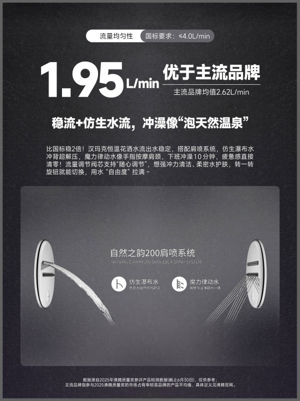 在原材料选择上,汉玛克拒绝任何妥协:产品主体采用A级优质黄铜与食品级PP材质,不含双酚A等有害物质,经CNC加工中心深加工确保高精密度,抗压耐腐蚀,从源头保障使用安全;出水面板选用医疗级硅胶,兼顾健康与耐用,水垢轻轻一搓即可脱落,解决了用户后期清洁的痛点;搭配“自然之韵200”肩喷系统,可模拟瀑布水的沉浸式冲淋与魔力律动水的舒适按摩,在家即可享受专业SPA级沐浴体验,满足用户对舒适感的核心需求。