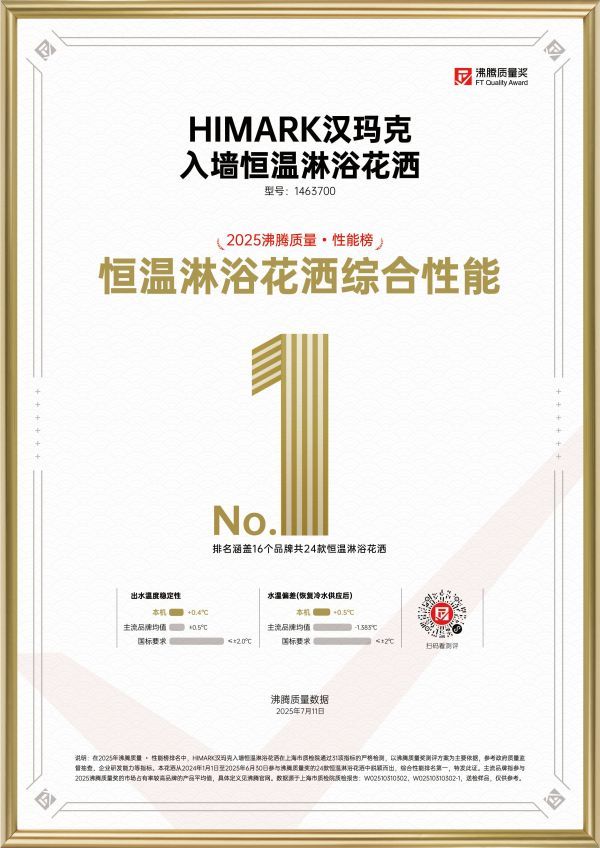 这场由上海市质量监督检验技术研究院全程承检的评选,覆盖16个主流品牌、24款恒温淋浴花洒,堪称“恒温花洒界的质量高考”。汉玛克以全维度领先的性能表现荣登综合性能榜NO.1,斩获“沸腾质量金奖”,其流量均匀性低至1.95L/min,优于国标2倍;阀芯灵敏度达18.35mm,超越国标53%,关键指标均大幅领先行业均值,这份“质量判决书”式的权威认可,印证了其行业顶尖的品质实力。