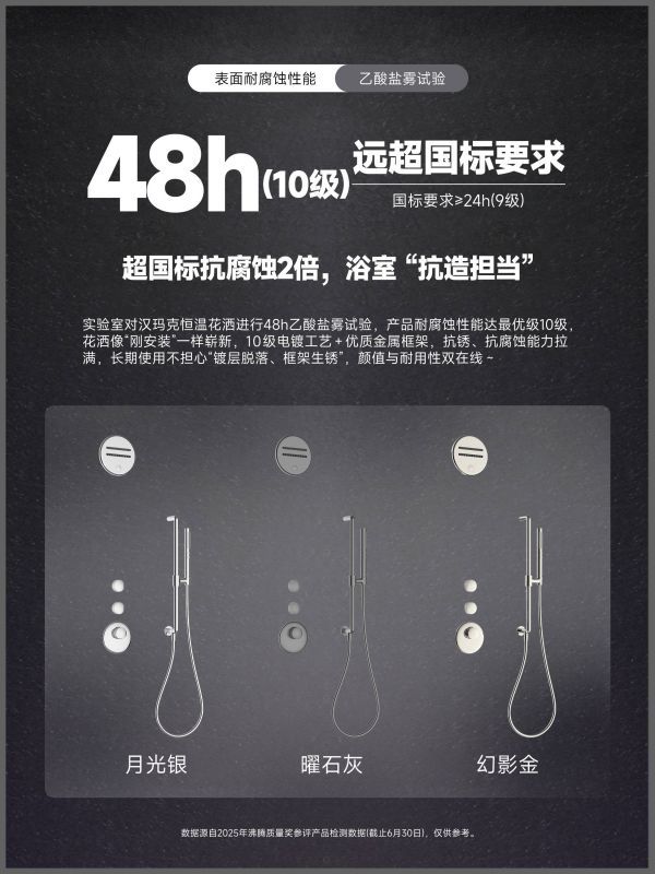 在工艺打磨上,汉玛克更将奢华质感融入细节:表面处理采用奢侈品同款PVD真空电镀工艺,形成致密保护膜,耐腐蚀性达到最高等级10级,经48小时乙酸盐雾试验验证,较国标24小时、9级的要求提升一倍,抗腐蚀能力是国标的2倍,即便在沿海高盐气候环境中,也能做到不易留水渍、耐刮擦,长久使用光亮如新。这种从材质到工艺的精益求精,既保障了产品的耐用性,又赋予其超越实用功能的奢华质感,完美契合高端用户“耐用与奢华兼具”的核心需求,这正是第一品牌深刻用户洞察的最佳体现。