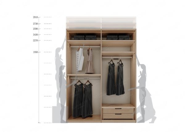 解决“秩序力”——建筑级模数系统(构建轻松优雅的生活秩序,让模数服务于人,而非生产)。其一,融于空间,浑然天成(空间秩序):柜体与墙体、门洞共用一套尺度,打破传统衣柜与空间的割裂感,让柜子成为空间的自然延伸;其二,黄金比例,自带韵律(立面秩序):以建筑模数设计衣柜立面,按模数倍数递增布局,拒绝杂乱分割,自带高级美学韵律;其三,国际大师,精工定尺(收纳秩序):从奢侈品专柜设计中汲取灵感,将Dior、杰尼亚等大牌的陈列美学融入衣柜设计,让居家收纳兼具实用性与仪式感;其四,动静分区,人体工学(操作秩序):以1950mm动静分离线为界,线下动区收纳常用衣物,触手可及,线上静区收纳换季物品,符合人体工学,兼顾便捷性与空间利用率。