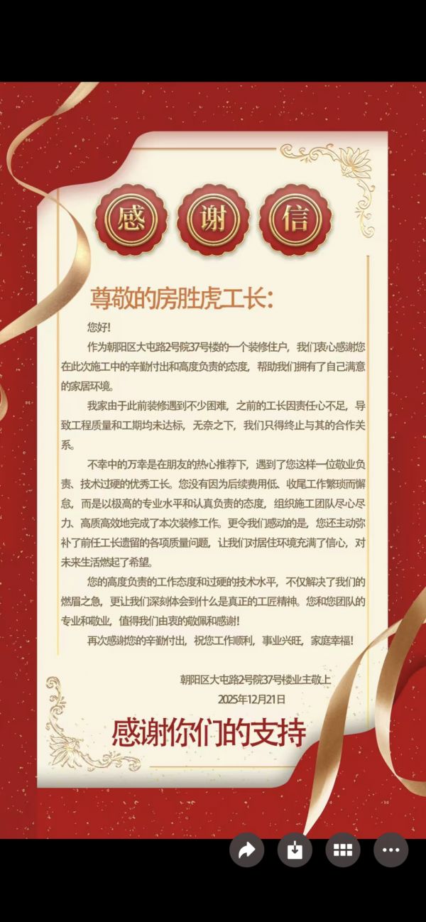 多位业主在信中不约而同地评价:“能遇到房胜虎这样负责任、懂专业、有温度的工长,是我们装修过程中最大的幸运。”
