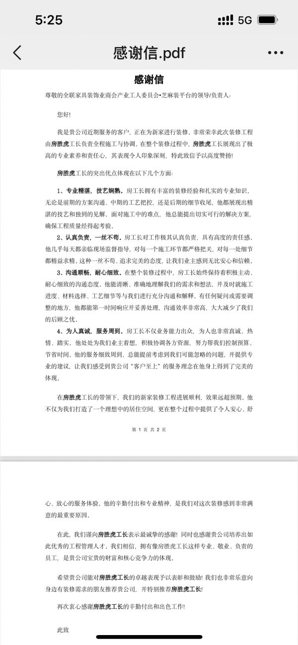 在一封封饱含温度的感谢信里,业主们用真实的经历讲述了与房胜虎工长的合作故事: