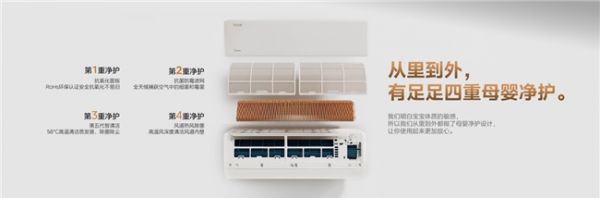 此外,考虑到宝宝呼吸道的脆弱,云朵二代构建了四重母婴级净护系统:从ROHS环保认证的抗氧化面板,到抗菌率达99.9%的抗菌防霉滤网,再到56℃高温除菌的第五代智清洁技术及风道热风除菌,全方位拦截内外机细菌与霉菌。滤网更是采用了二氧化硅疏水涂层,支持“5秒快洗”,轻轻一冲即净,让每一口呼吸都干净如新。