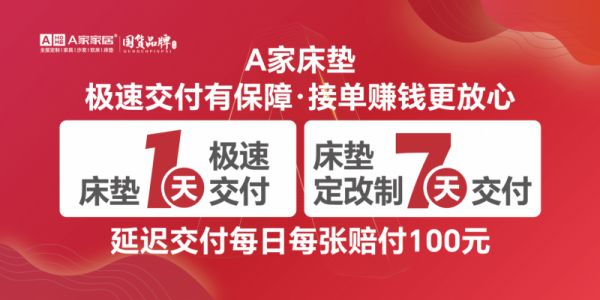 人气与签约双丰收的背后,是A家家居敢承诺、敢兜底的十足底气。品牌全力优化供应链与物流体系,重磅承诺:床垫现货1天极速交付,床垫定改制7天交付,延迟交付每日每张赔付100元。真正让经销商卖得安心、消费者买得放心!