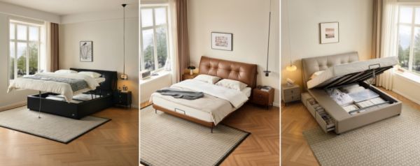 慵懒布朗尼皮床,面料层、贴合层、填充层、支撑层、框架层,五维精研配比,打造沉浸式放松体验。60cm加高饱满靠包,最厚处足足33cm,内填优质高弹棉,贴合腰背曲线,柔软舒适。1.4mm进口头层牛皮面料,温润细腻,自然荔枝纹理,尽显优雅大气。32根加密排骨条,稳稳承重均匀分压,翻身静音,守护每一夜的安稳深睡。常规高脚款、平开储物箱体款、侧抽储物箱体款,三种配置贴心应对不同需求;焦糖棕、松露黑、杏仁色,三款颜色,满足不同装修风格。