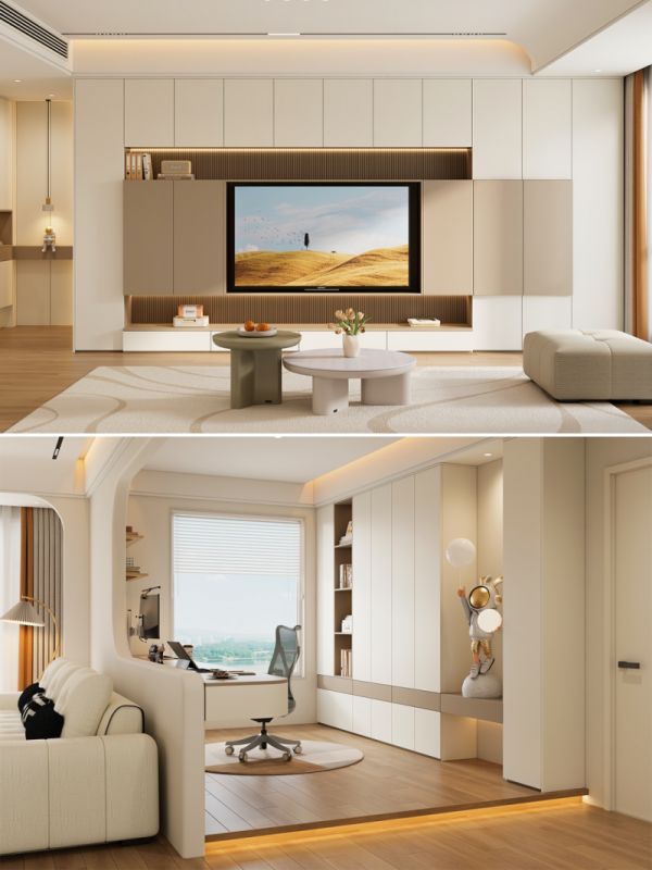 电视墙以栅格造型打底,增强空间层次感。电视柜采用进退与穿插设计,打破平面的单调秩序,上下留空赋予空间呼吸感,视觉上更显开阔而不压抑。