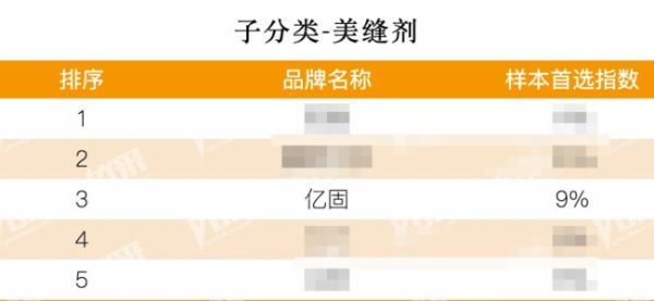 作为建材辅料隐形冠军企业,亿固凭借卓越的工程实力与市场口碑成功入选,揽获两大核心品类殊荣:瓷砖胶以10%首选指数位列第四,美缝剂以9%首选指数跻身前三,实现连续七年荣耀登榜,彰显了企业在建材辅料领域的非凡影响力。