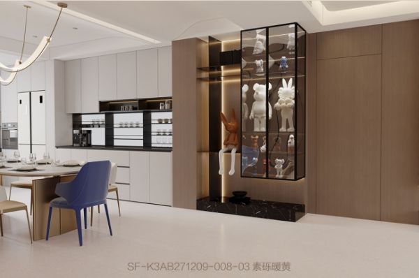 暖调的浅米黄色基底,是素砾暖黄给人的第一印象。其颗粒以米白、浅黄为主,辅以少量淡灰细点,纹理柔和朦胧,仿佛将午后晒暖的细砂铺展于地面,自带一种温润的松弛感。这种低饱和度的暖色调,既能承接空间的精致感,又不会显得张扬喧闹。其细碎的颗粒让大面积铺贴不显单调,而柔和的“轻肌理”又能平衡空间中的厚重元素。