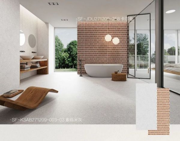 如果说有一种颜色能够完美适配任何风格,那一定是素砾米灰。其基底是柔和的浅灰白色,点缀着细密的浅灰、深灰、米白小颗粒,并夹杂极淡的暖棕细点,整体呈现出如揉入浅灰砂的柔雾质感,视觉上清爽干净。这种“百搭型质感砖”的魅力在于,它既能撑起空间的简约底色,又能通过细腻的肌理提升细节的精致度,让整个空间显得通透、高级。