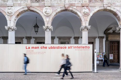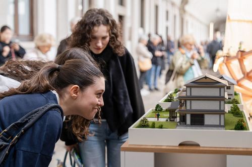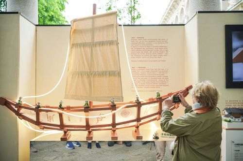 米兰大学古老回廊内,人流如织,千年舟特别定制的艺术装置“汇”静置其中。以“舟”为核心意象,榫卯结构构建骨架,舟身之上,承载“纹艺觉醒”IP历年来花色纹样灵感,向世界呈现中国木文化的深厚底蕴与当代创新表达。