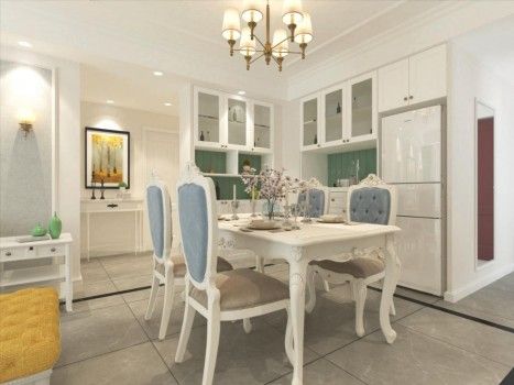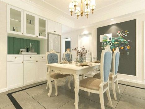 将冰箱从厨房中拿出来,嵌进餐厅旁储物柜中,整齐美观,墙面贴磁性黑板贴,打造属于宝宝的绘画天地。矮鞋柜上面定制玻璃隔断,增加厨房与进门过道采光的通透性。