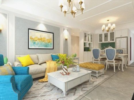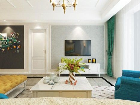 沙发背景墙与电视背景墙做呼应的石膏线和墙布,整个空间更协调大气,美式壁灯点缀墙面,整个空间更加精准。