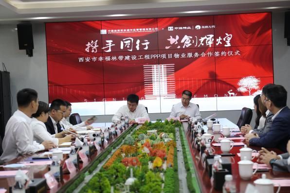 双方公司代表签署《西安市幸福林带建设工程PPP项目物业管理合同》。