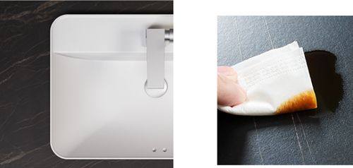 吸水率低于0.02%,表面防水,这意味着岩板台面具有极易清洁的优势,温水擦拭或清理足以保持表面清洁卫生,非常适合卫浴间的环境。