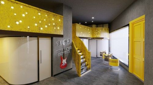针对培训机构的受众人群,亭颐设计在空间颜色上用了饱和度高的亮色,给人生动明艳的第一观感。因为乐器多维金属材质,亭颐设计别出心裁的用铁皮做了楼梯和扶手,镂空透光,显得轻盈而利落,颇有种工业风的金属质感。作为设计趣味的添加,几位拿着不同乐器的玩偶穿插其中,更可见设计师的心思。