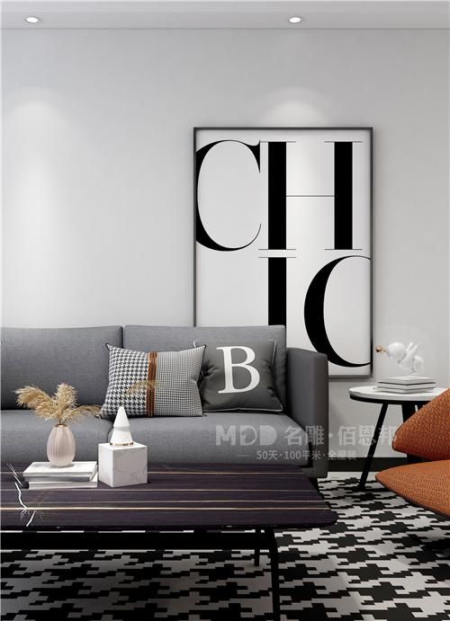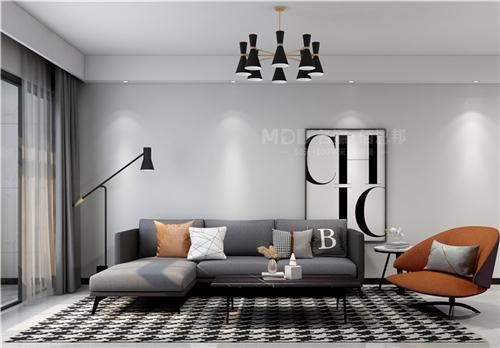 喜欢极简风的朋友,这样的装修方案你会喜欢吗?空间以灰色调入场,灰色的墙面粉刷,灰色系的窗帘,灰色大气的布艺沙发,经典耐看,耐污抗污,搭配千鸟格地毯,字母装饰画,点缀以时尚脏橘色,为空间注入一丝活力,满屏大牌感。