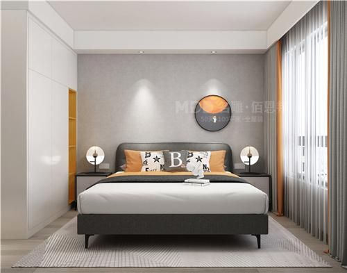 软皮全包床靠,舒适指数up,整个空间的配色也与客厅同步,同样以脏橘色为点缀色,为空间增彩。