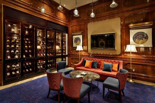 主餐区的一侧设计了一排半私密包房。走廊与总体设计风格一致,浅色经典的调性,配衬格子墙和大理石地板。包房则有3种各具特色的风格。有较为正式的木质格子间,格调阳刚。