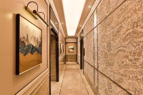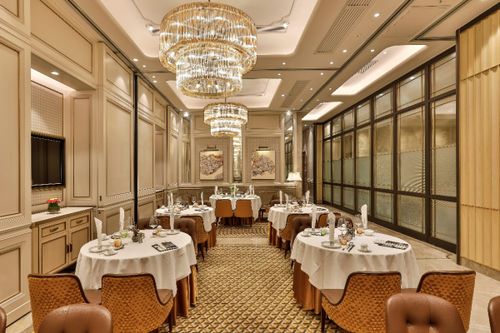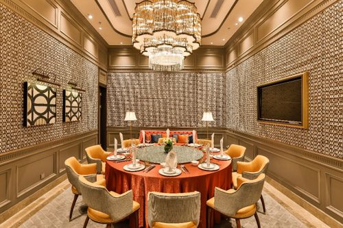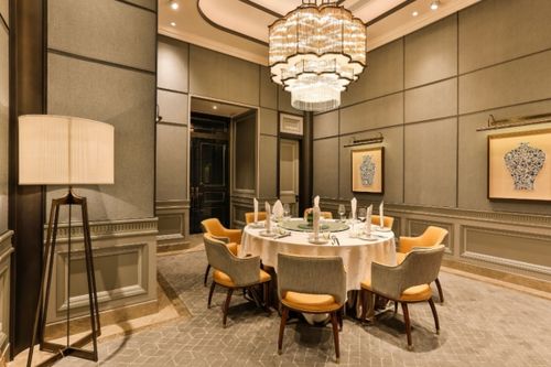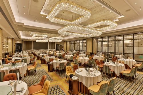 主餐区是一个两层挑高的轩敞的餐饮空间,色调浅淡优雅,明黄的地毯,花色非常有艺术感,与家具风格十分吻合。还有富丽堂皇的中式吊顶,古董镜, 色彩飘逸的厅柱,浅色的格子墙以及黄铜装饰,使得整个空间活泼又不乏雅致。