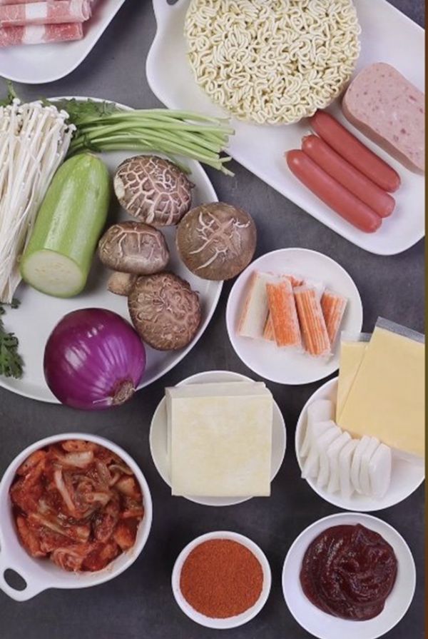 韩式辣酱70克,韩式辣椒粉15克,辛拉面1包,芝士片2片,老豆腐300克,洋葱1个,肥牛片200克,泡菜200克,香菇6朵,金针菇适量,蟹味棒适量,午餐肉适量,西葫芦适量,火锅年糕适量,茼蒿适量,小香肠适量。