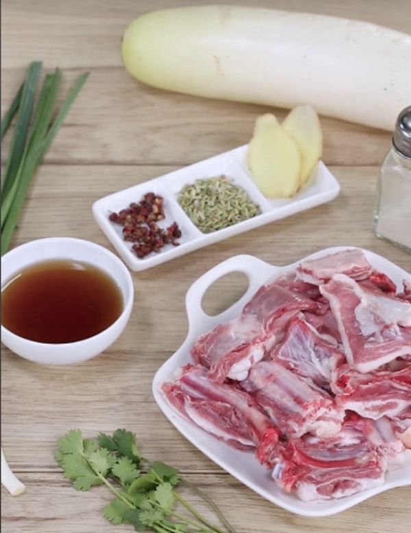 羊排600克,白萝卜1根,香菜3根,姜两片,青蒜2根,小茴香3克,花椒3克,料酒50毫升,盐6克,胡椒粉适量。