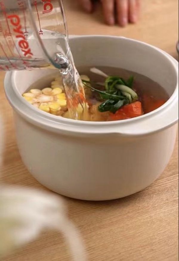 3.砂锅中加入焯水后的排骨、玉米、胡萝卜、葱结和姜片,一次性加入足量的清水后淋入10毫升料酒。