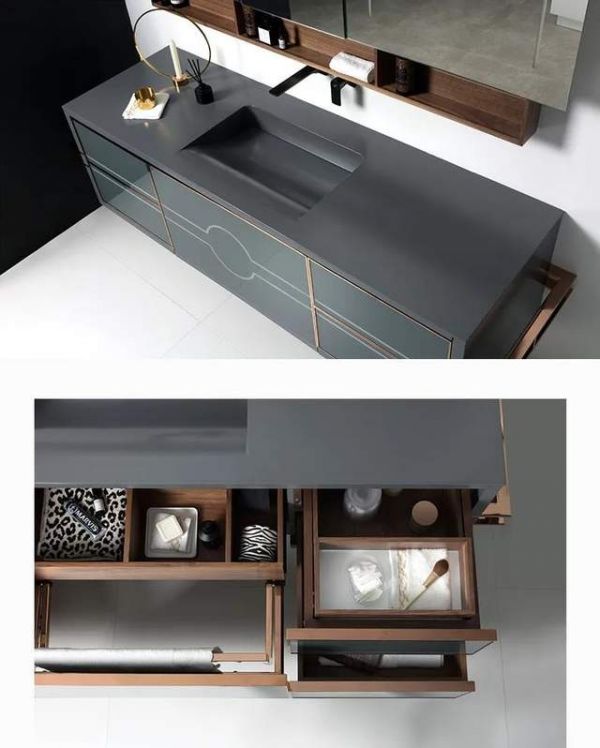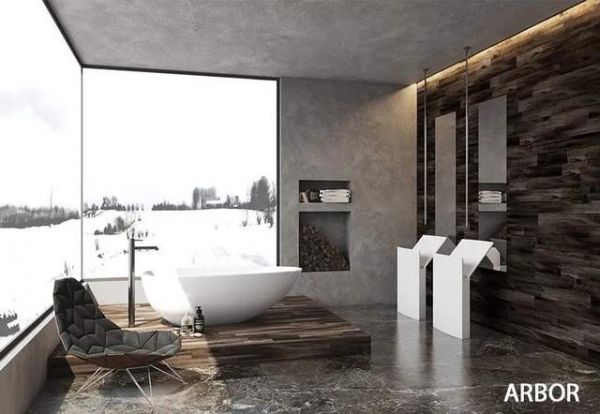浴室柜的设计把深色原木和白色做了完美结合。一体式台盆的设计,不得不说是品牌的佳作。与窗外苍白洁净的雪形成匹配,与自然风格毫不冲突,并带来了功能实用性。每一处都在追求自然的本真。