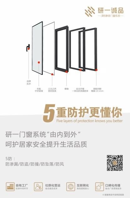 然后我们主打的“5防静音系统门窗”其实坦率的讲应该是系统门窗的一个通用性能,当然我们有自己的一些技术研发在里面,那我们为什么要把这个放大出来、讲出来,是为对消费者有一个实实在在的承诺,时刻提醒研一人走大路,走正道。系统门窗这个行业起步时间短,又看似简单,我们不能成为走小路、走捷径的一小部分群体,那样行为就会扭曲。