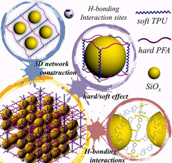 该粘结剂的软质弹性组分(TPU)可以缓冲SiOx的体积变化,保证SiOx在循环过程中的电荷传输,硬质塑性组分(PFA)可构建