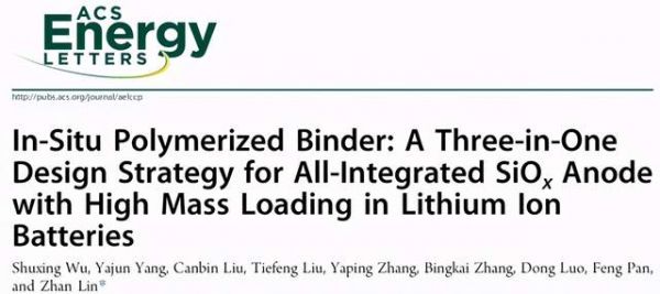 Shuxing Wu, Yajun Yang, Canbin Liu, Tiefeng Liu, Yaping Zhang, Bingkai Zhang, Dong Luo, Feng Pan, and Zhan Lin*. In-Situ Polymerized Binder: A Three-in-One Design Strategy for All-Integrated SiOx Anode with High Mass Loading in Lithium Ion Batteries.