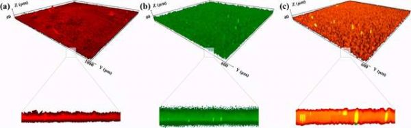 Figure 1. Characterizations of 3D network: images of PFA-TPU/SiOxelectrodes with binders of (a) PFA, (b) TPU, and (c) PFA-TPU. The upper row is the 3D images, and the bottom row is the cross-section images (length: 200 μm).