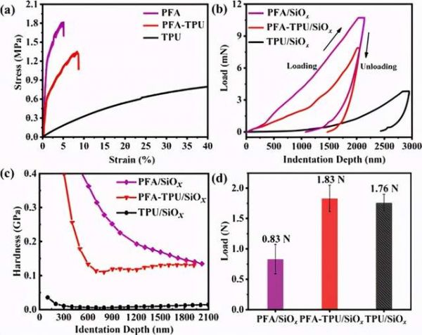 Figure 2. Characterizations of hard/soft effect: (a) strain−stress curve of the polymers and (b) load-indentation depth curve, (c) hardness, and (d) peeling test results of the electrodes.