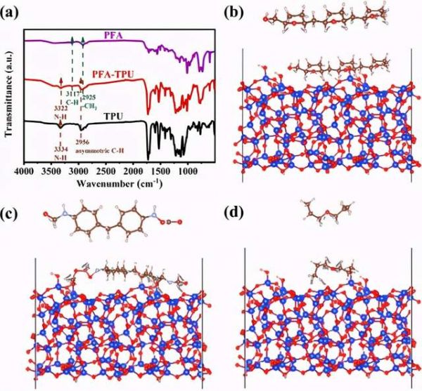 Figure 3. Characterizations of H-bonding interactions: (a) FIIR spectra of PFA, PFA-TPU, and TPU. Adsorption configuration for (b) PFA, (c) TPU-m, and (d) TPU-n over the amorphous SiOx surface. White, brown, red, dark blue, and light blue spheres represent H, C, O, Si, and N atoms, respectively.