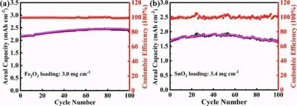 为证明粘结剂的普适性,将粘结剂分别应用于具有高比容量和大体积膨胀的商用Fe2O3和SnO2负极材料。Fe2O3质量负载为3.0 mg cm-2时, PFA-TPU/Fe2O3电极在激活后,经过100圈后面积容量稳定在2.4 mAh cm-2。在活性物质负载为3.4 mg cm-2的条件下,PFA-TPU/SnO2电极经过100圈后面积容量稳定在1.7mAh cm-2。