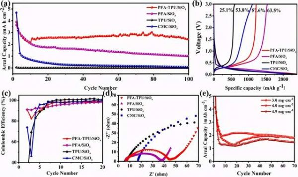 PFA-TPU/SiOx电极具有优异的循环性能,在高负载条件下(>3.0 mg cm–2),经过100次循环后,电极的面积容量保持在2.4 mAh cm-2,在4.9 mg cm-2超高负载量下,电池同样保持良好的稳定性。PFA-TPU/SiOx电极首次库伦效率虽然较低(63.5%),但在5个循环内迅速上升,之后表现平稳,验证了其在后续循环中优越的长循环稳定性(图4c)。值得一提的是,PFA-TPU/SiOx电极相比于PFA/SiOx电极具有更低的首次库伦效率和更大的界面电阻,然而,PFA-TPU/SiOx电极仍然表现出更好的循环性能。因此,证明复合粘结剂的设计合理性。