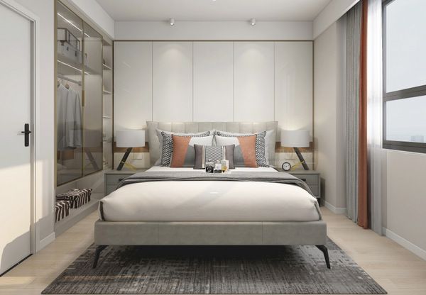温暖的多层实木地板,传递着温情,灰玻嵌入式衣柜,在金色收边条的装饰下,流溢轻奢,全包软靠大床,给足安全,踏实感满满。